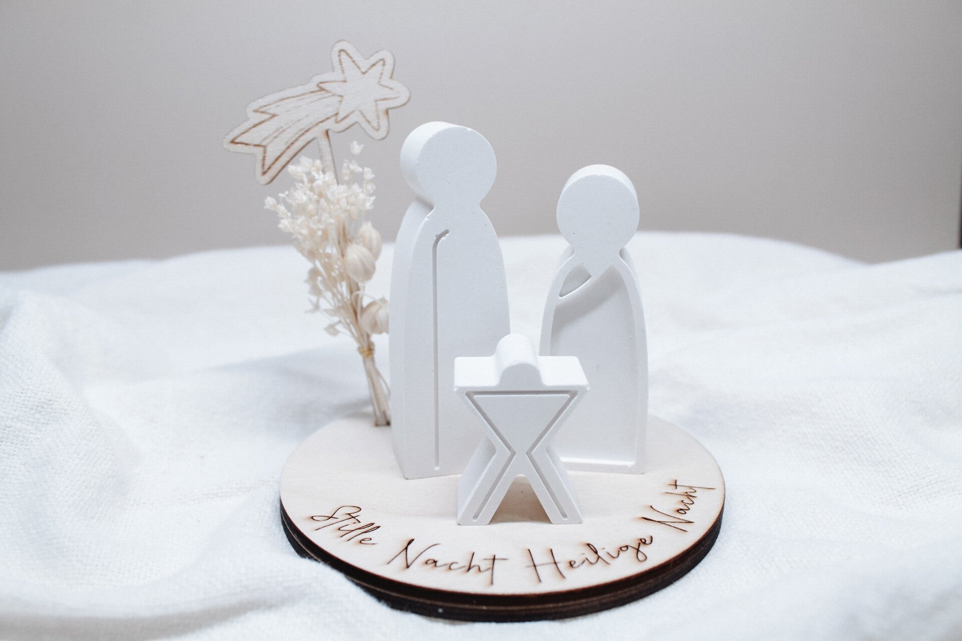Die Figuren sind aus Gips gegossen und dekoriert mit einem beschrifteten Untergrund und einem Stern aus Lindenholz. Dekoriert mit Trockenblumen.